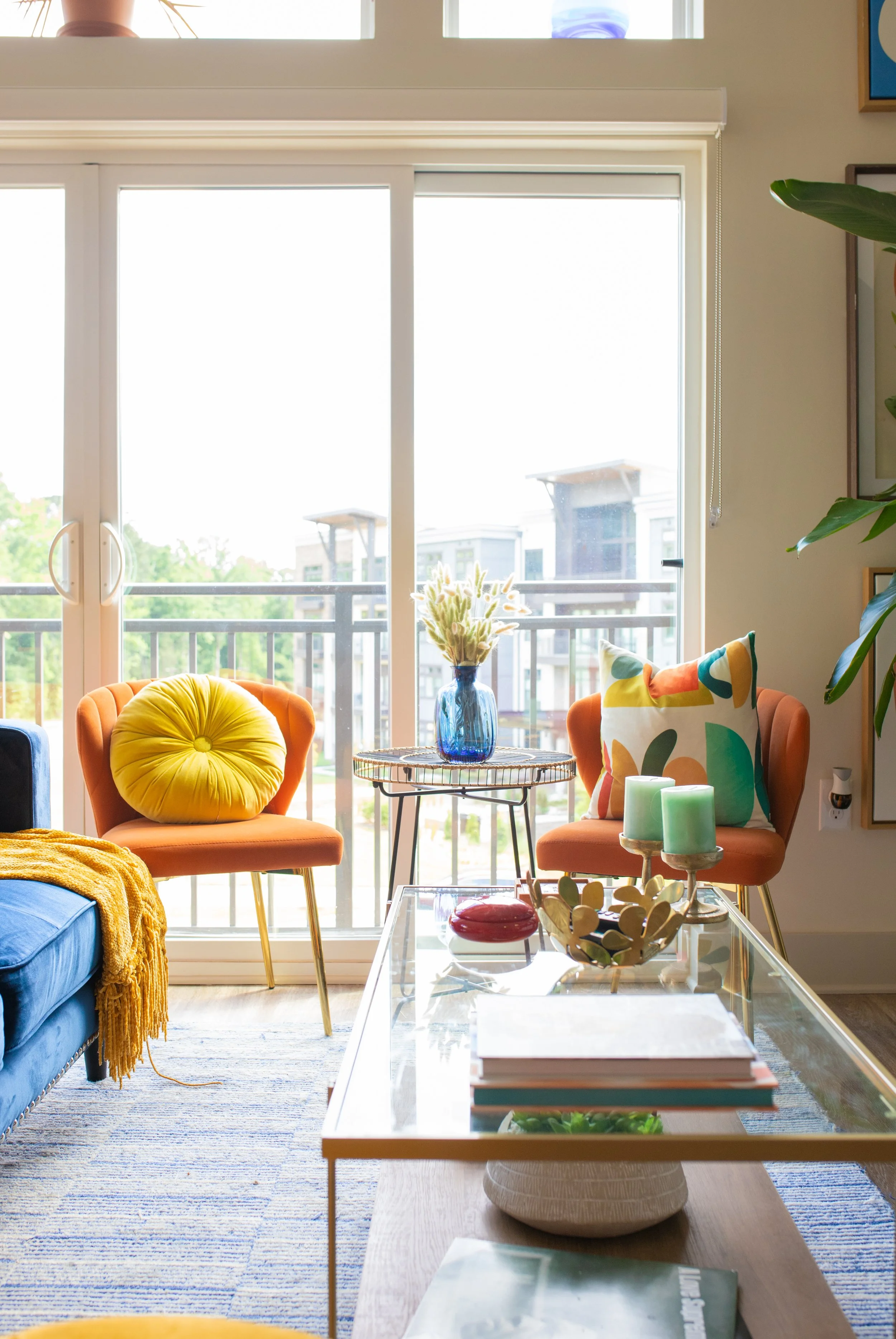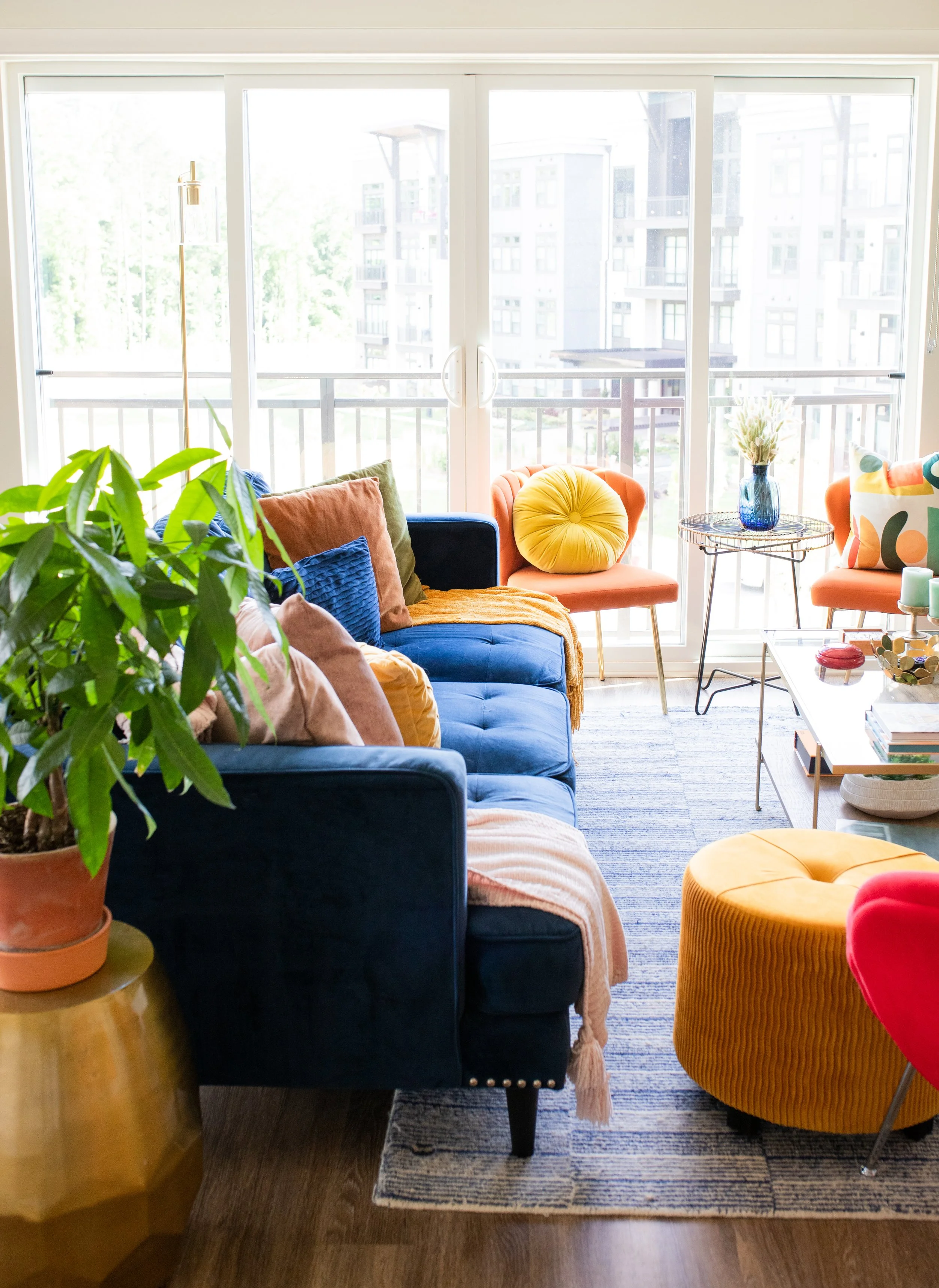 This is where it all began, at least in the physical. Located in Indian Land, South Carollina, this one-bedroom, corner unit apartment was complimented by two beautiful floor to ceiling windows and sliding glass patio doors that ran perpendicular to one another. These windows allowed a beautiful landscape of direct sunlight day-in, and day-out, that inspired the use of many colors, patterns, and even more plant life. This canvas and home was a chance to have fun, push the boundaries of what the modern age of interiors was leaning into, and show others that it was okay to love color and use lots of it.