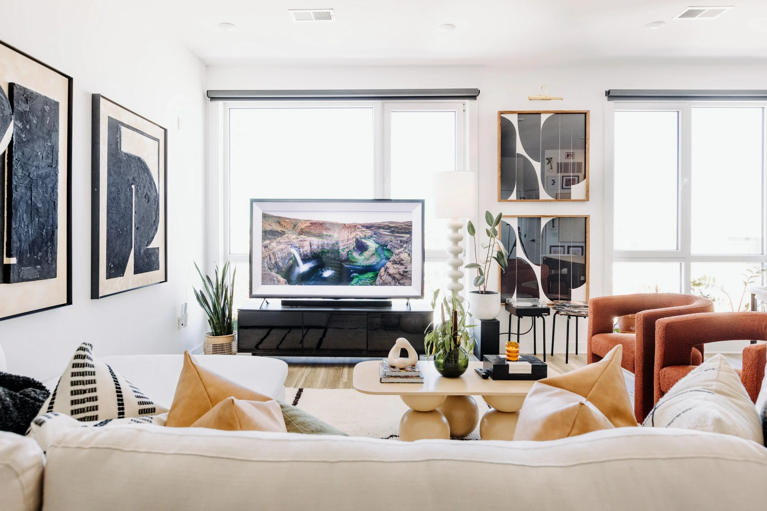 York Place, located in Philadelphia, Pennsylvania, is a project drenched in sophisticated cohesion, playful patterns, and complimentary textures. This 3-bedroom condo is a twist of contemporary, modern, and mid-century modern styles. While this space utilized more neutral colors, and natural wood tones for it's base, the playful use of color shined through to surprise you at every turn. DIY's and craftsmanship were a major player in this project to keep things unique and personalized. While DIY's aided in costs savings, the use of high and low end furnishings also proved that it can be done, and still look like a high-end home.